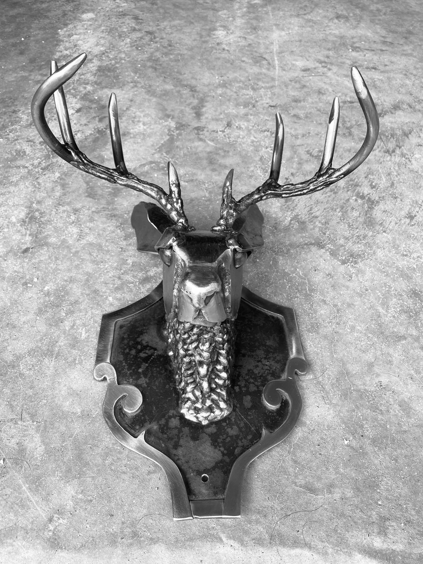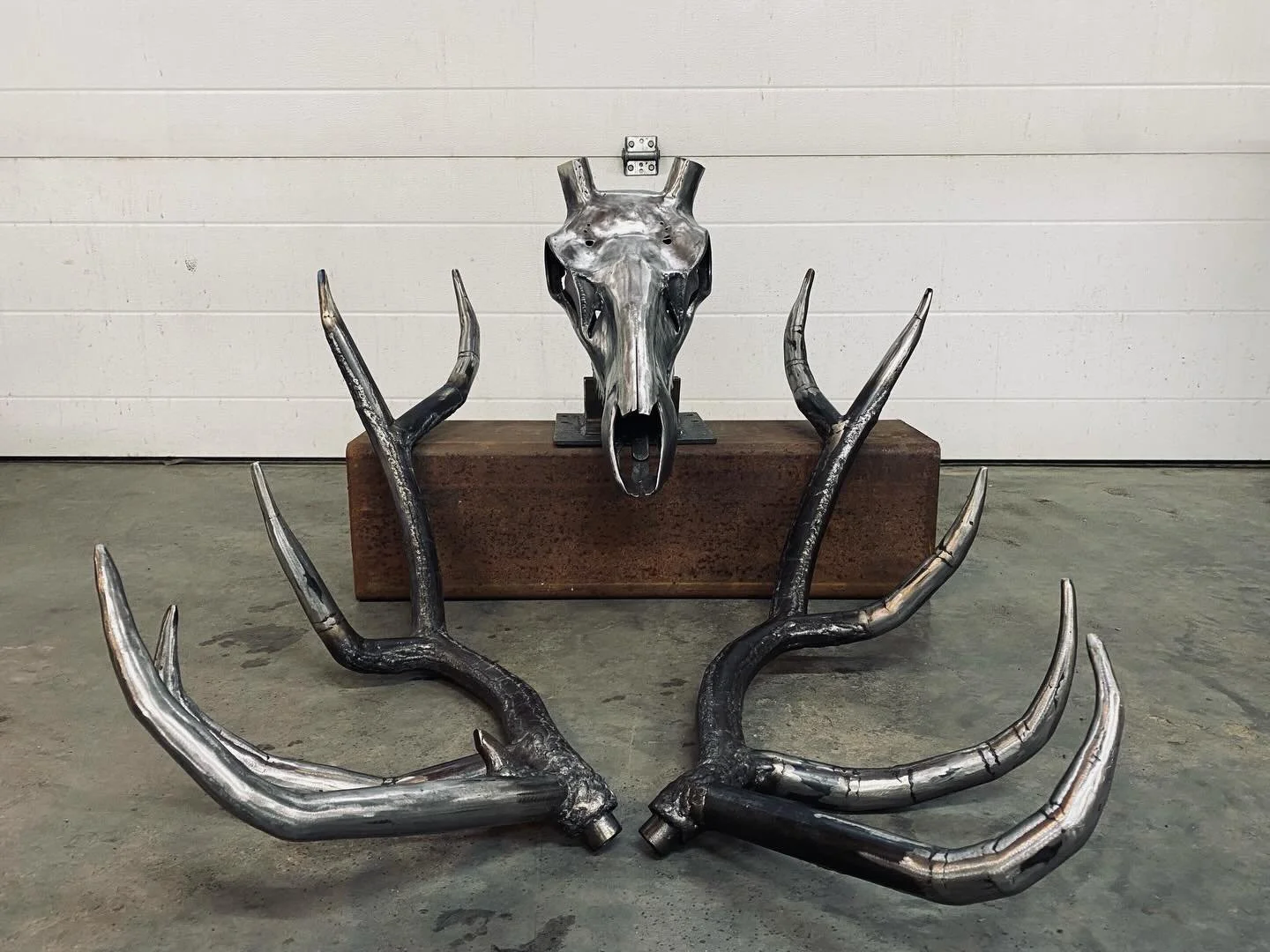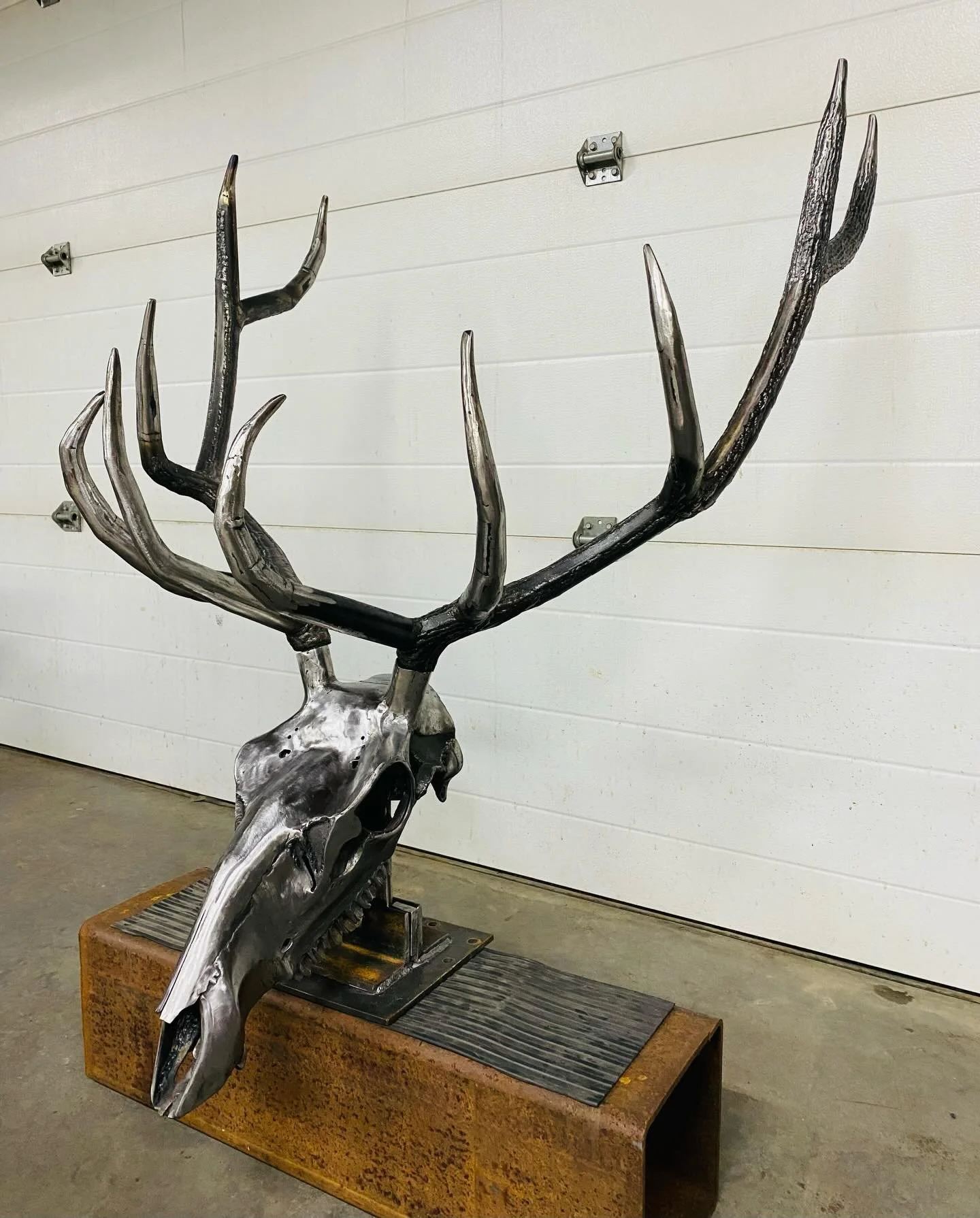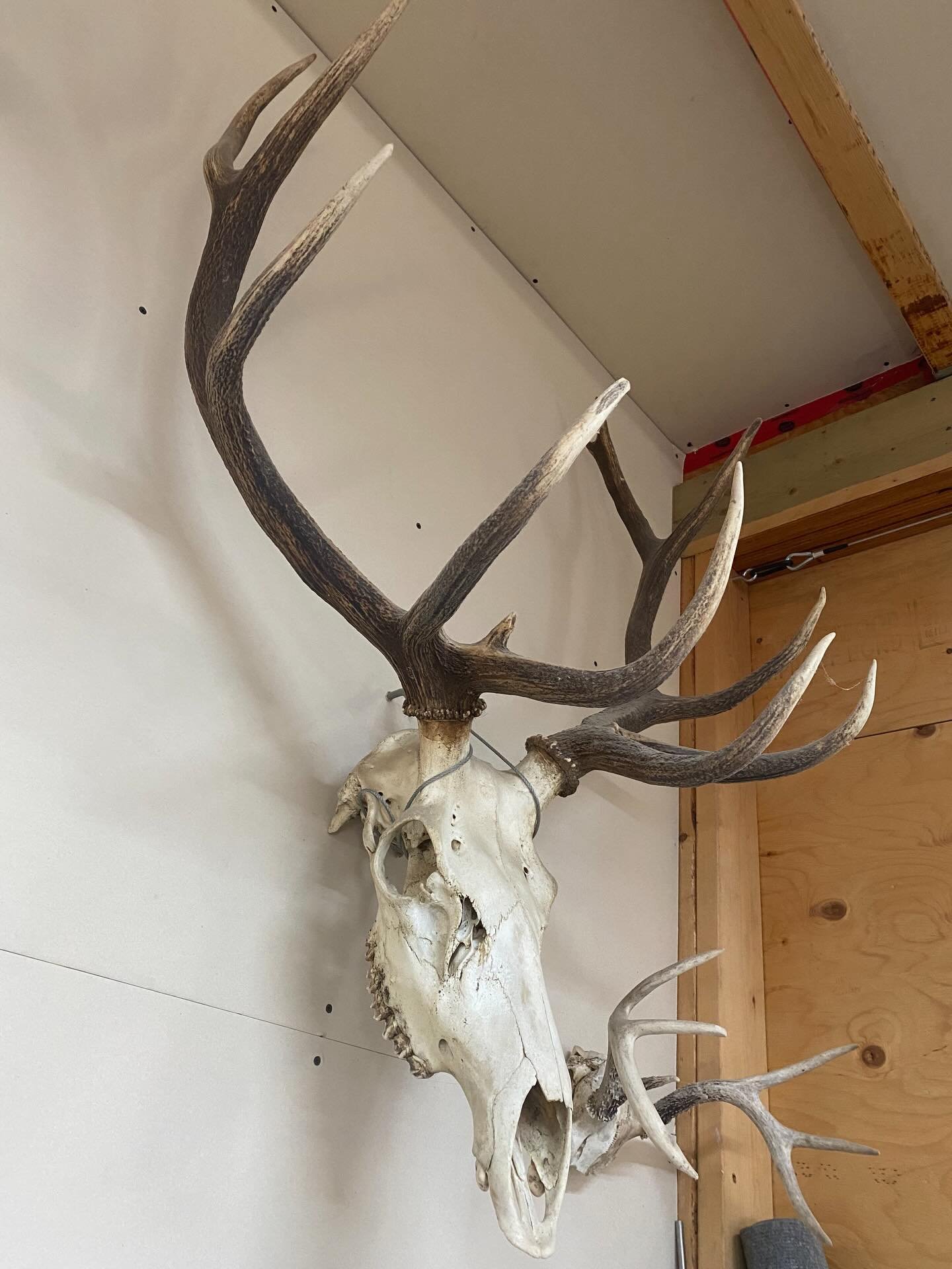 Elk skull with full rack. Inspired by an elk found on our propperty, several years ago, cleaned up and hung on the wall.